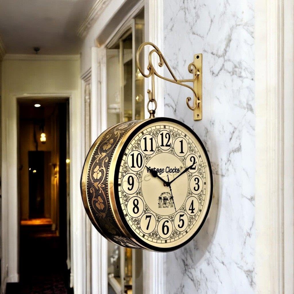 Vintage Handcrafted Double Sided Railway Style Iron Wall Clock, 10x10 Inch, Brass Colour, Analog